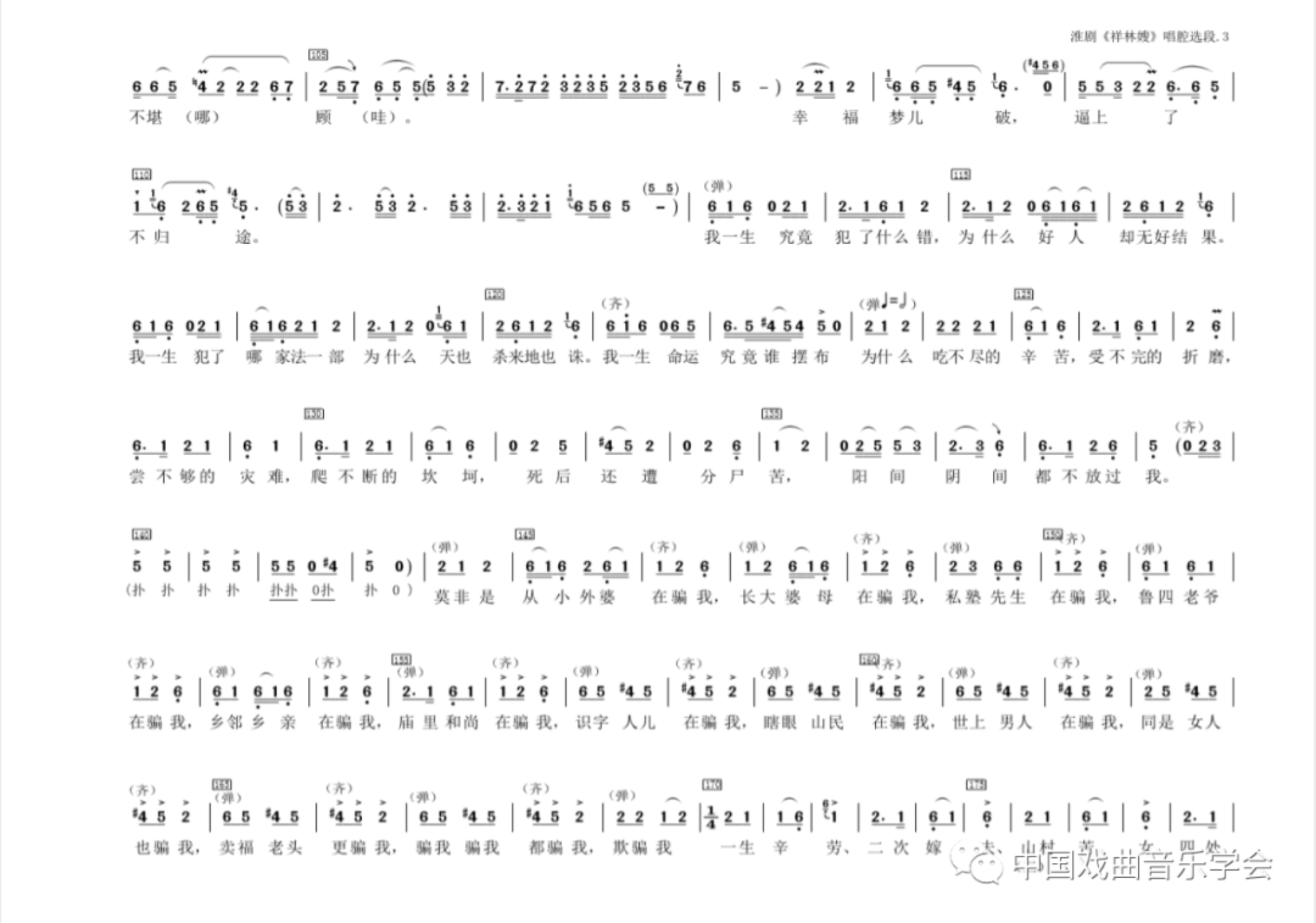 从105小节开始是唱腔的后半部分。现成的传统唱腔不足以表现唱词所赋予的内容了,创新发展的成分偏多了。