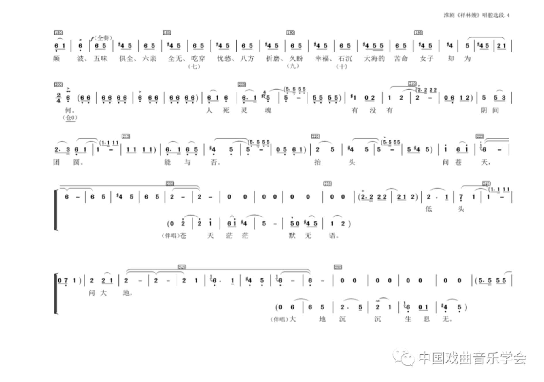 《祥林嫂》核心唱段《天问》,选用的正是“淮调”曲牌。这段唱腔较长。在唱腔的前半部分(开头至104小节),我怀着十分虔诚的心情,最大限度地沿用了传统“老淮调”的板式结构和唱腔旋律。基本上做到原汁原味。