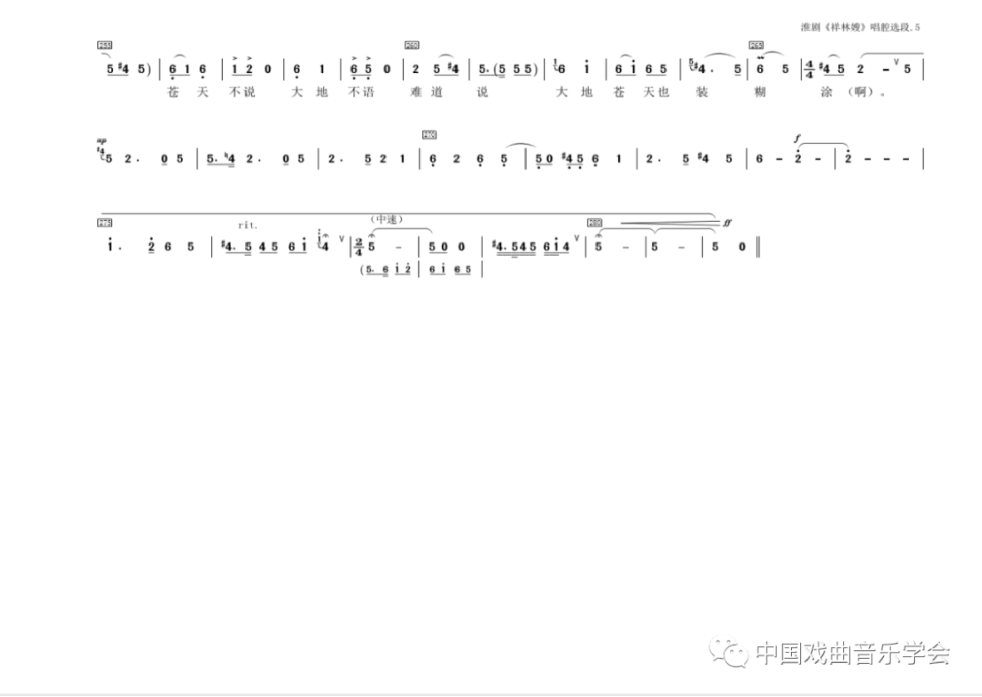 这个动机运行于“淮调”曲牌的所有腔句中,形成了该曲牌特有的旋律个性。变徵到徵的进行,在中高音区表达悲愤、激动等情绪,在低音区又具有哭泣音调的特点。变徵到徵的进行还起到一个导音对主音的支撑、稳定调式的作用,在乐段终止处尤为明显。而旋律下行时带波音的还原清角到商的进行,实际上是个转移了调性的宫到羽的进行,是苏北田歌、号子的音调缩影,充满了浓郁的地域色彩。文章至此,我不得不再次由衷惊叹、感佩淮剧前辈艺人的超凡创造!