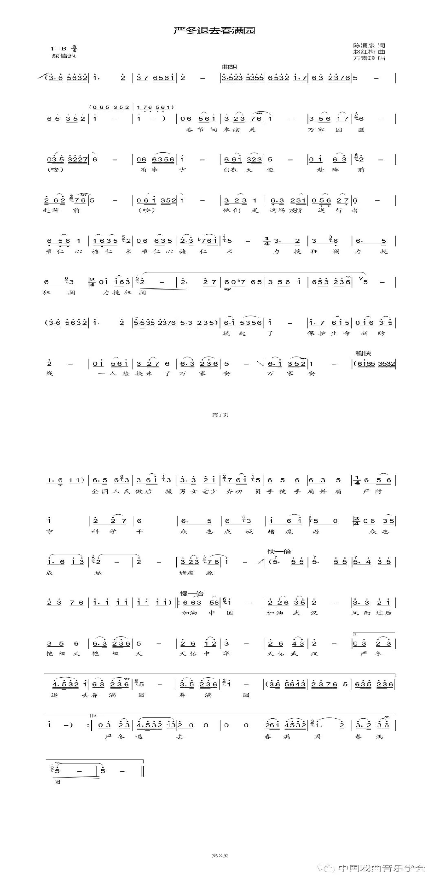 作品以河南曲剧音乐为素材,由曲胡演奏开头过门导入唱腔,用音乐语汇娓娓道来春节万家团圆时,白衣天使赴阵前行的情景,一展河南地方戏的婉转优雅。在 “一人险换来了万家安” 唱腔结束后,节奏突然加快,音乐坚定有力的向前推进,表达疫情当前,全民众志成城,积极抗疫,终将迎来“严冬退去春满园”的信心与期盼。