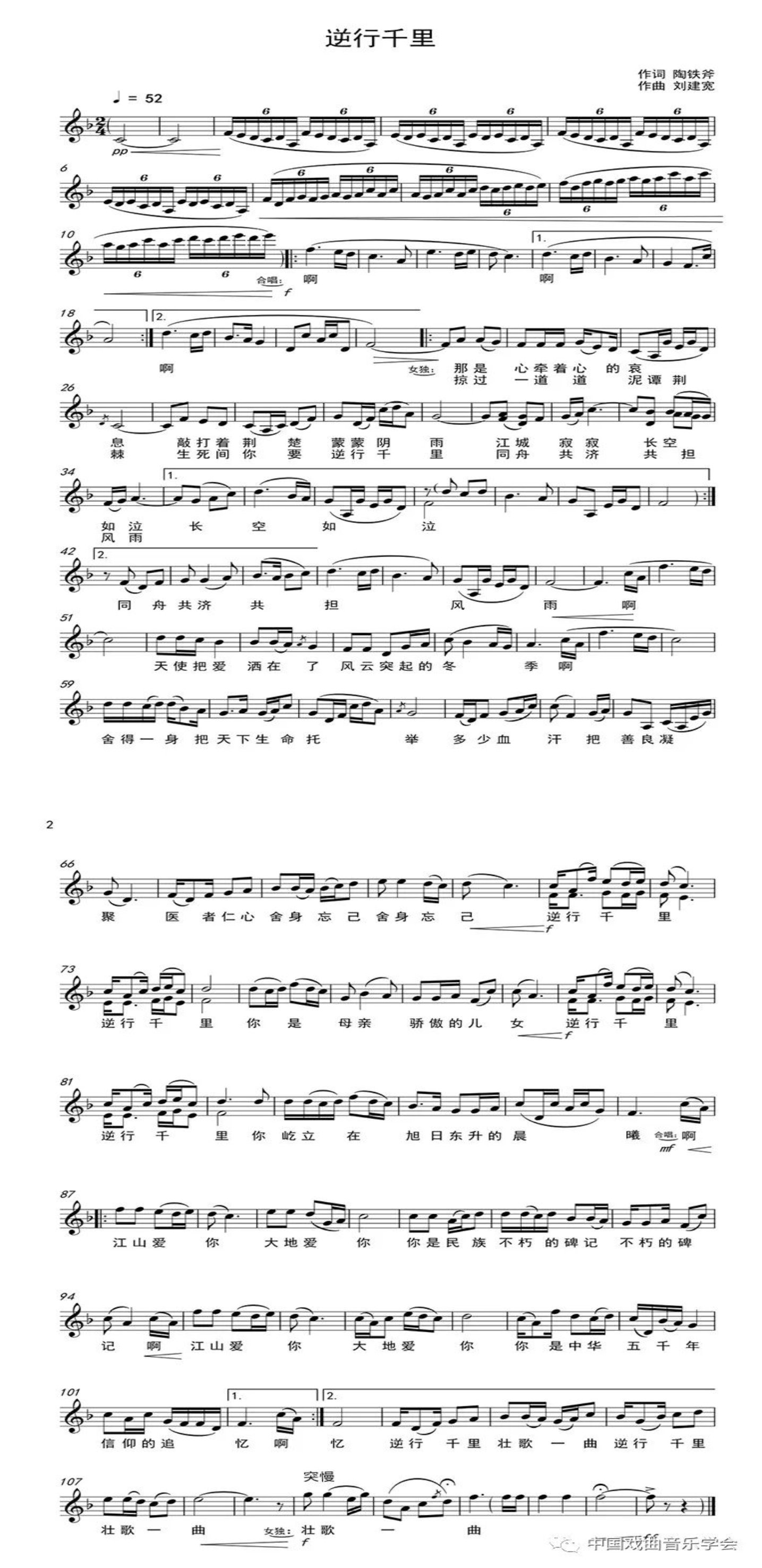 越歌《逆行千里》以越剧音乐元素进行创作。歌曲刚开始的平静由弦乐铺垫的不和谐木管声部打破,紧接着管弦乐队全奏式的渐强模进旋律提升了凝重的音乐氛围,男女声合唱引出娓娓道来的对唱,“江城寂寂,长空如泣”,旋律细腻柔婉,但又坚定凝重,将逆行千里的决心与同舟共济的精神予以唱颂。歌曲最终以跌宕起伏的合唱配合雄伟的管弦乐伴奏结束。这首越歌饱含深情的歌颂了抗击疫情中的最美逆行者,向奋斗在一线的每位工作者致敬。