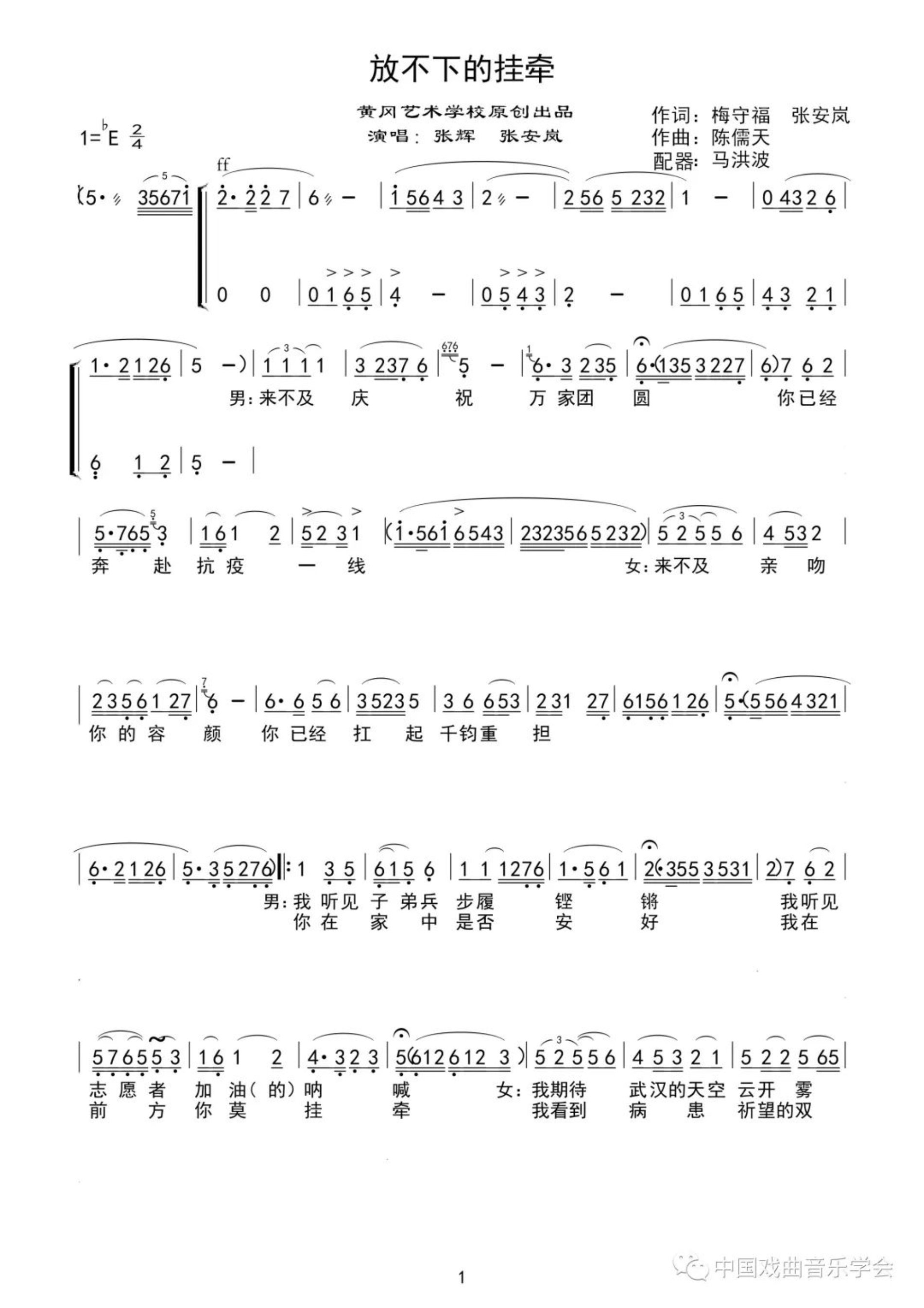 在这个特殊时期,由黄冈市人大常委会干部梅守福作词、著名黄梅戏作曲家陈儒天作曲、黄梅戏名家张辉、张安岚倾情演唱的黄梅戏歌《放不下的牵挂》于2020年3月23日首发。该作品得到了中国戏曲学院张尧教授、谢振强教授及马洪波老师的大力支持。