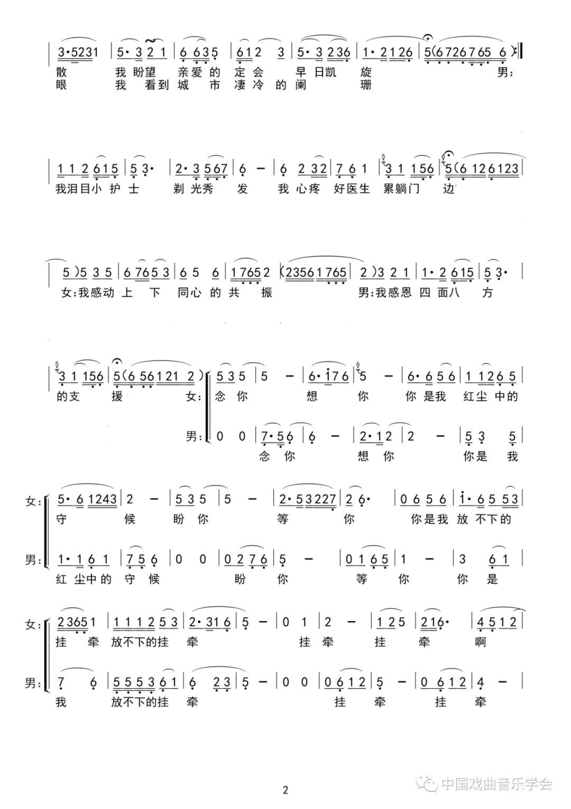 此歌采用了黄梅戏观众喜闻乐见的男女对唱表演形式,热情地歌颂了抗疫英雄们的家国情怀。曲式结构为并列三段体,A段取材于黄梅戏【彩腔】,为表现疫情来得突然、迅猛、紧急,打破了【彩腔】惯常节奏框架,而大胆连续运用三连音节奏型。B段更多地保留了黄梅戏【彩腔对板】的传统特色,在旋律方面作某些拓展,是为了更好地歌颂抗疫一线的英雄。C段属新编男女二重唱,此时音乐意境得以升华,充分表现了曲中男女主人公的浪漫主义革命情怀。