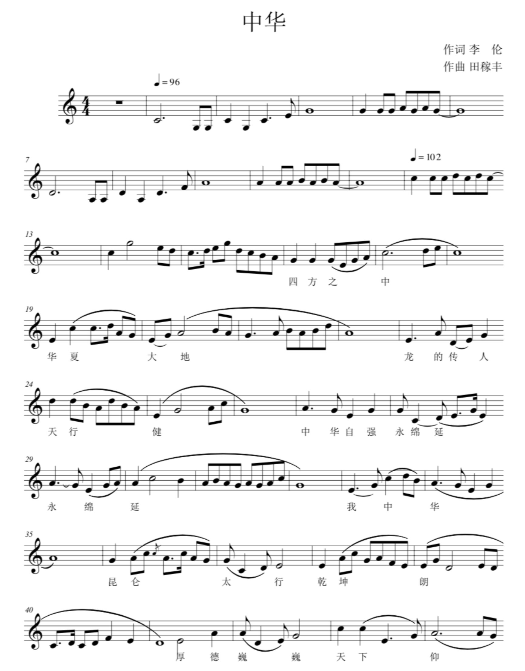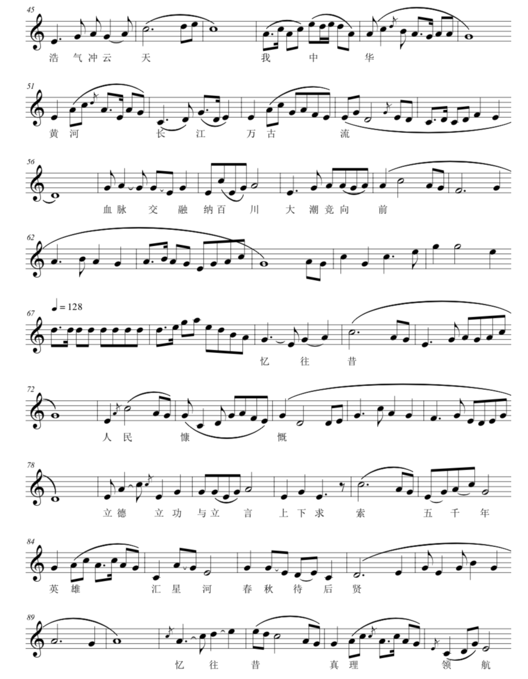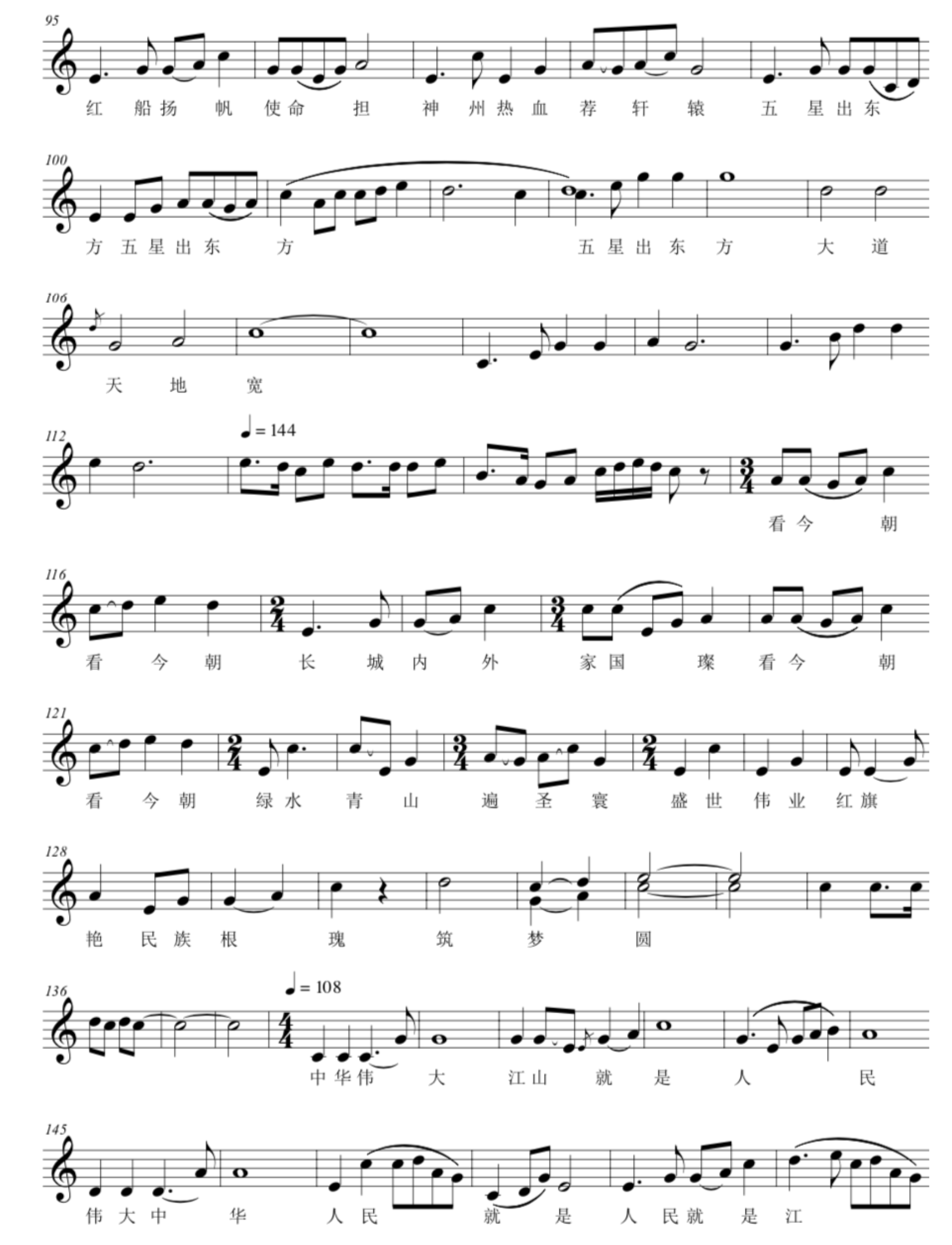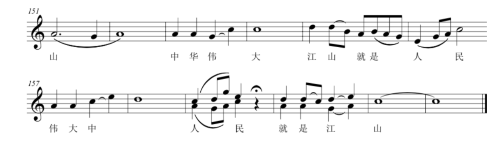 作品以越剧音乐为元素,将歌曲结构与越剧唱腔融合,独唱、重唱、合唱相结合,既保持传统越剧声腔艺术特点,又融入现代音乐语汇,形成了鲜明的艺术个性和特色。情绪饱满、韵味十足的越剧女小生和花旦演员的轮唱,形成了生旦亮丽音色的鲜明对比。作品将歌曲《国歌》《春天的故事》及《没有共产党就没有新中国》的标志性旋律巧妙隐显结合在一起,创作出引人共鸣的前奏与间奏过门,显得温暖而更有力量。在结尾部分,反复歌颂“中华伟大,江山就是人民,伟大中华,人民就是江山”,旋律在模进中将整部作品推向高潮。