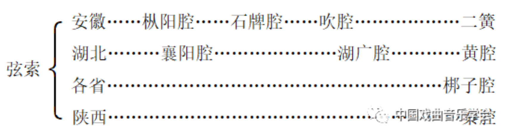但源流研究在倚重文字记载的同时,也常常表现了一种忽视音乐本体考察的倾向,即不注意将文字记载与声腔的音乐实际紧密结合起来,甚至有时是弃音乐于不顾。戏曲之腔毕竟属于音乐的范畴,而且是一种很复杂的对象,旧籍对音乐情况的记述常常停留于只言片语、虚泛笼统,因此研究者不了解声腔的音乐本体状况,对声腔历史轨迹的勾画便必然有很多想当然的成分。这里举一个简单例子:王芷章《腔调考原》最后有一张声腔源流表,这里截取其中一个局部,即“弦索”分化衍变为其他腔的部分:㉔