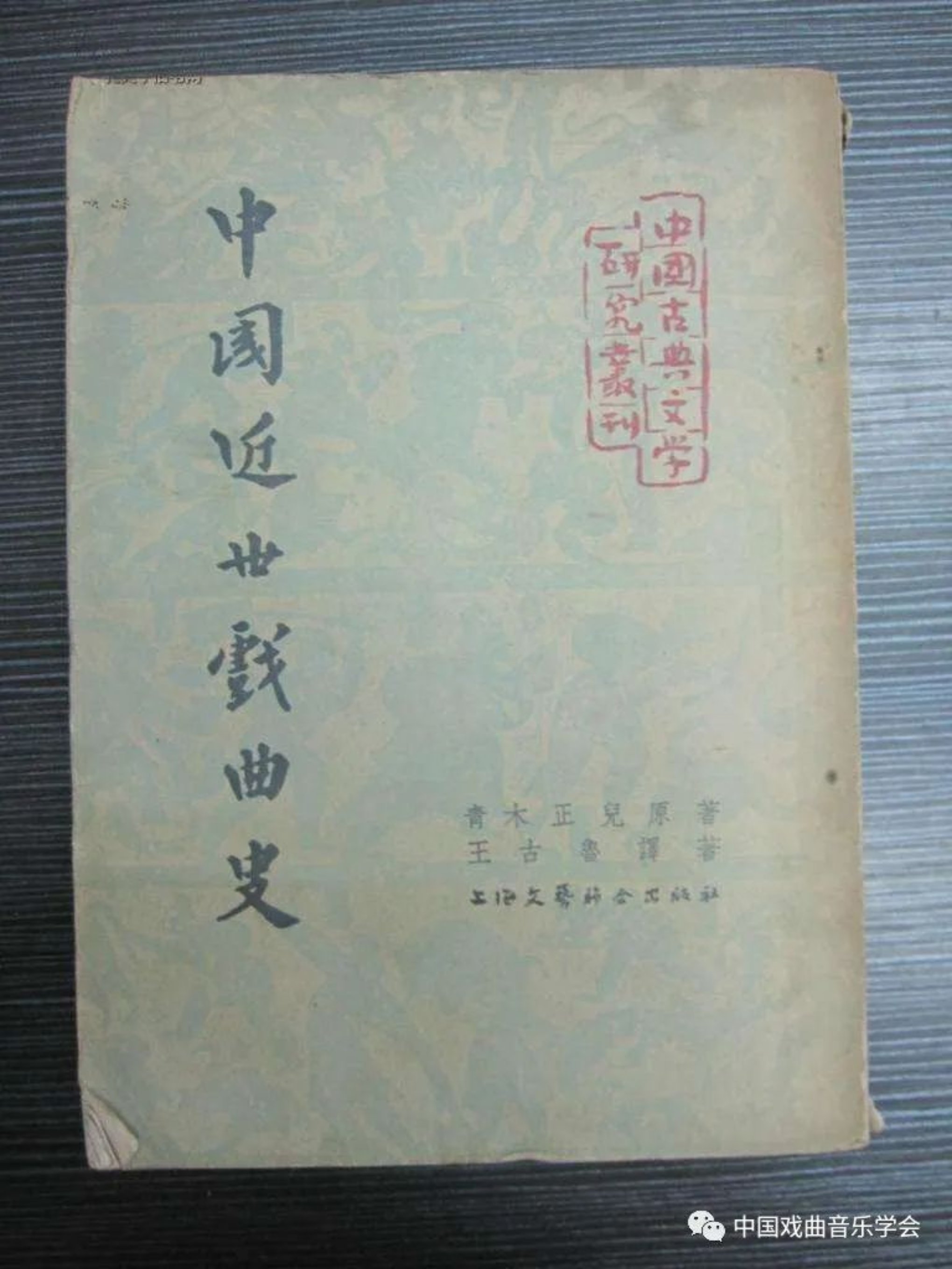 民国时期的戏曲史著述,已开始重视对声腔历史的追溯。如日本学者青木正儿著《中国近世戏曲史》(有1933年郑震译本、1954年王古鲁译著本等),记述了清代“花部”诸腔的不少情况,后来戏曲声腔研究中常常用到“源流”“遗响”“花部诸腔”“花雅兴亡”等重要概念,在该书中都已出现。