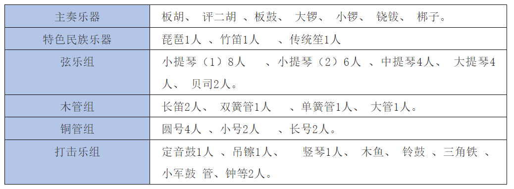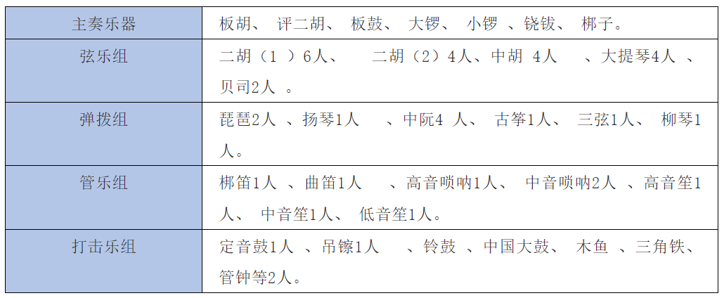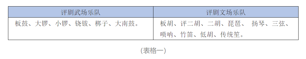 上世纪50年代,评剧现代戏得到了空前的发展,涌现了一批精品剧目,如《刘巧儿》《杨三姐告状》《金沙江畔》《夺印》《向阳商店》等等。评剧乐队为了适应现代戏的发展,扩大乐队规模,在原来乐队编制基础上又加入了民族乐器。下面是上世纪50年代左右的乐队编制。见表格一