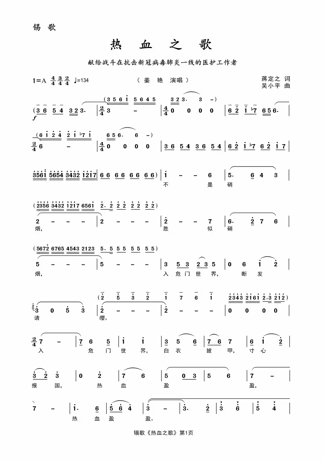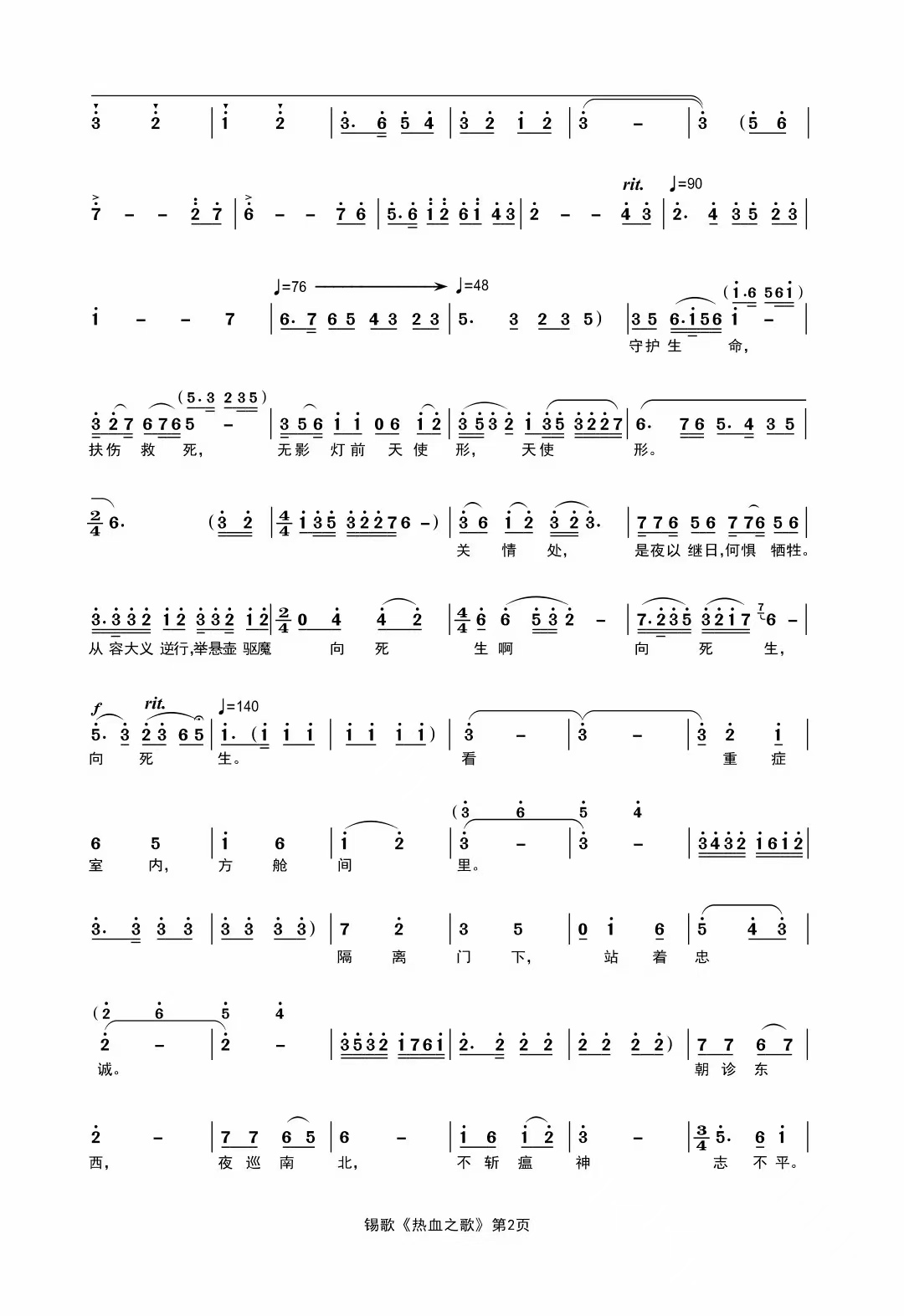 在国家重要的抗疫时期,用自己的作品去凝聚人民的信念,是每一个文艺工作者的使命。曲作者在音乐创作时遵循“麻雀虽小,五脏俱全”的理念:时长四分钟的作品尽可能赋予其丰富的情感和音乐上多样的变化。这首锡歌的唱腔以紧打慢唱开场,铿锵有力的音调配合“热血盈盈”的歌词,将演唱引入跳跃的花腔。“守护生命,扶伤救死”,配合抒情细腻的慢板,深情赞美白衣天使用生命和坚守诠释的“大爱”。情绪转入激动的快板后,歌曲也进入高潮的尾声,最后以高音区“四海晏清”的美好祝福结束全曲。歌曲运用传统的结构与锡剧的音乐素材,孕育出江南水乡特有的细腻旋律与跌宕起伏的丰富情感。