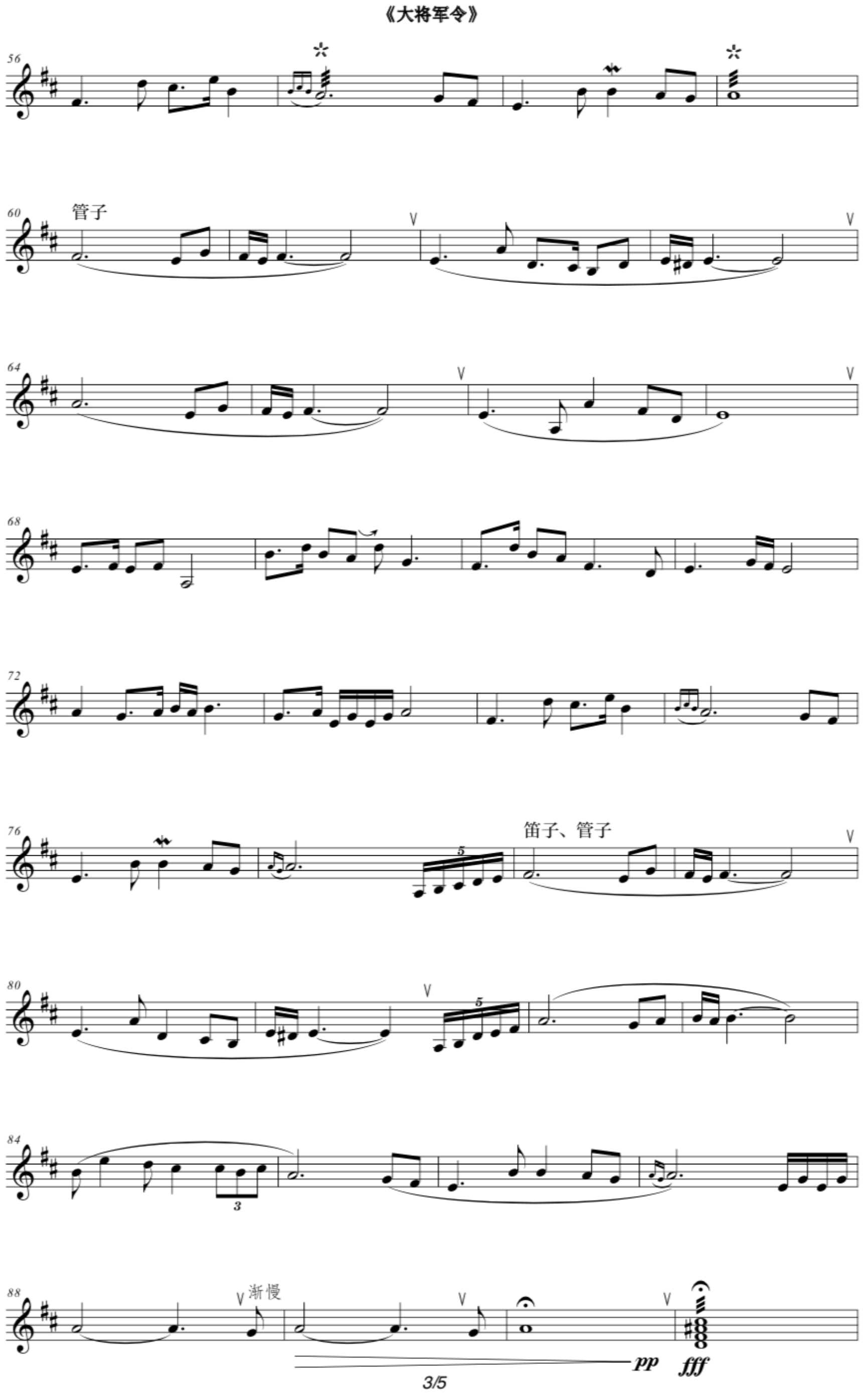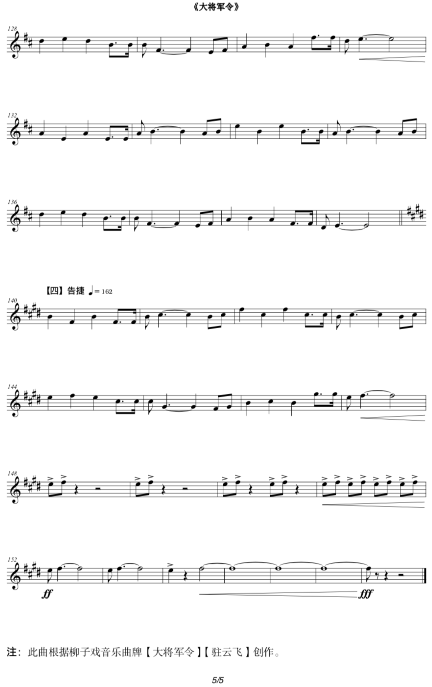 该作品以山东柳子戏传统唢呐曲牌【大将军令】和唱腔曲牌【二板驻云飞】为元素进行创作完成的民族管弦乐曲,共分集结、诉别、激战、告捷四个章节,创作中运用现代作曲技法与多声部写作相结合,和声配器细腻恢弘,是具有600年传承历史的柳子戏发展藩篱的一次勇敢尝试。取材于新时代国防和军队鲜活实践,抒发了创作者对中国人民解放军奋进历程之感怀,讴歌人民子弟兵峥嵘岁月,“听党指挥、能打胜仗、作风优良”的光荣传统和优良作风。歌颂强军征程新时代华章,浪花激昂,长风浩荡,踏上强军兴军新征程,定当继承先锋精神,锻造当代铁血劲旅。