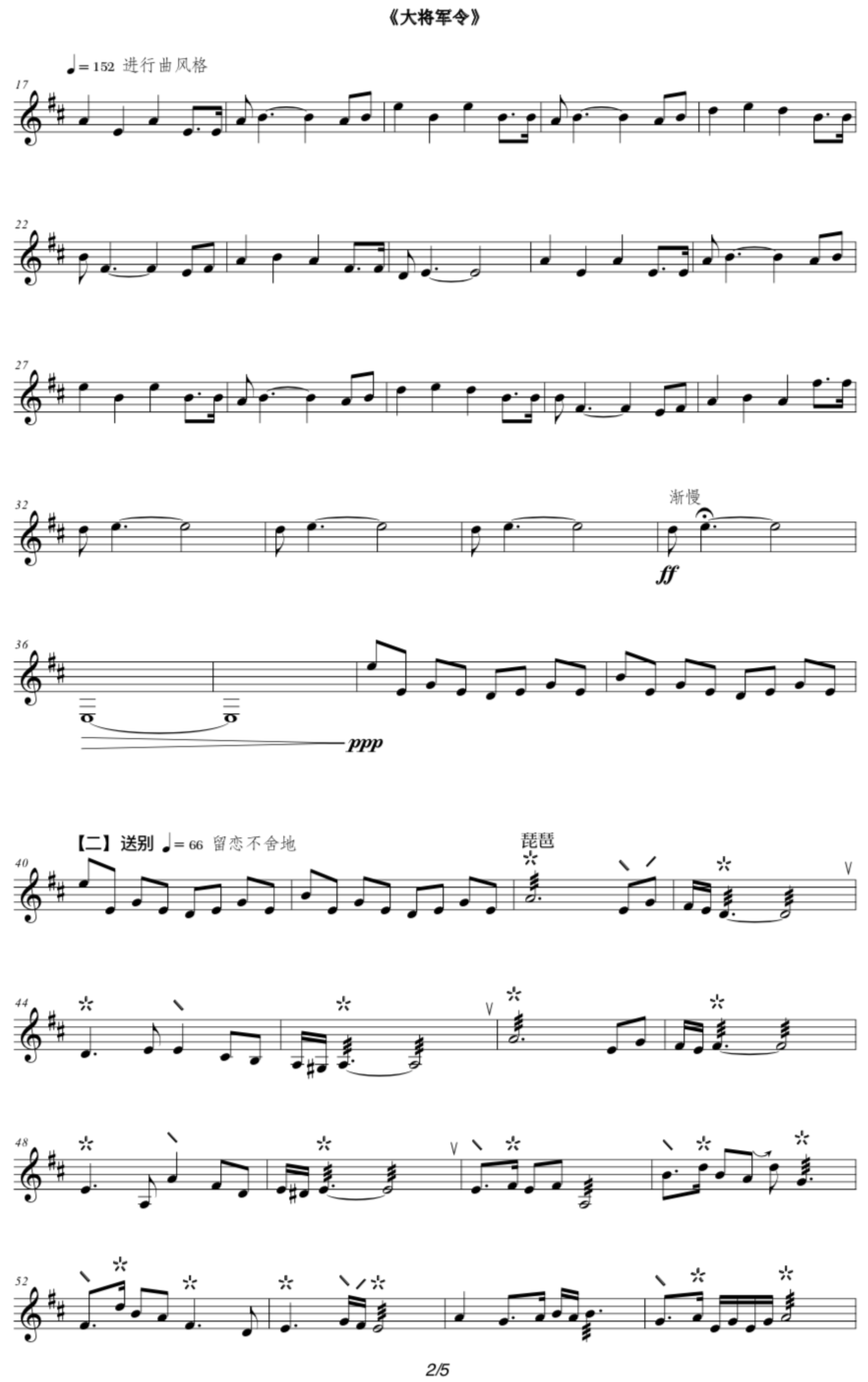 其中“诉别”音乐素材选自传统唱腔曲牌【二板驻云飞】,旋律舒缓,通过细腻柔美的琵琶和婉转悠扬的管乐之间的绝妙配合来表达依依惜别之情,“剪不断,理还乱,是离愁,别是一般滋味在心头”。而“集结”“激战”“告捷”则选自传统唢呐曲牌【大将军令】,旋律节奏豪迈壮阔、气势如虹。展现了中国人民解放军牢记使命职责,锻造雄狮向复兴,筑起坚不可摧安全屏障的丰功伟绩,战鹰振翅疾风起;虎鲸潜行深海腾蛟龙,战舰逐梦大洋勇争锋,彰显了人民子弟兵面对世界百年未有之大变局从容不迫的气度和敢于战胜一切来犯之敌的坚强决心。
